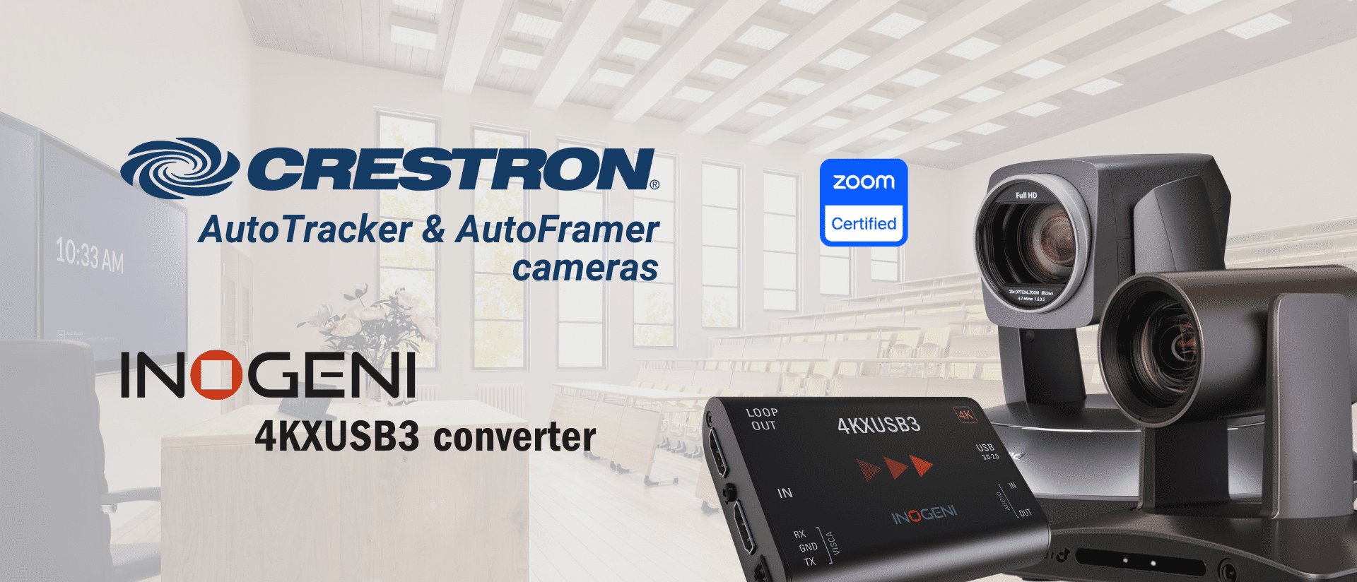Here is the list of the Crestron cameras certified for Zoom Rooms® software with the INOGENI™ 4KXUSB3 converter for camera control.