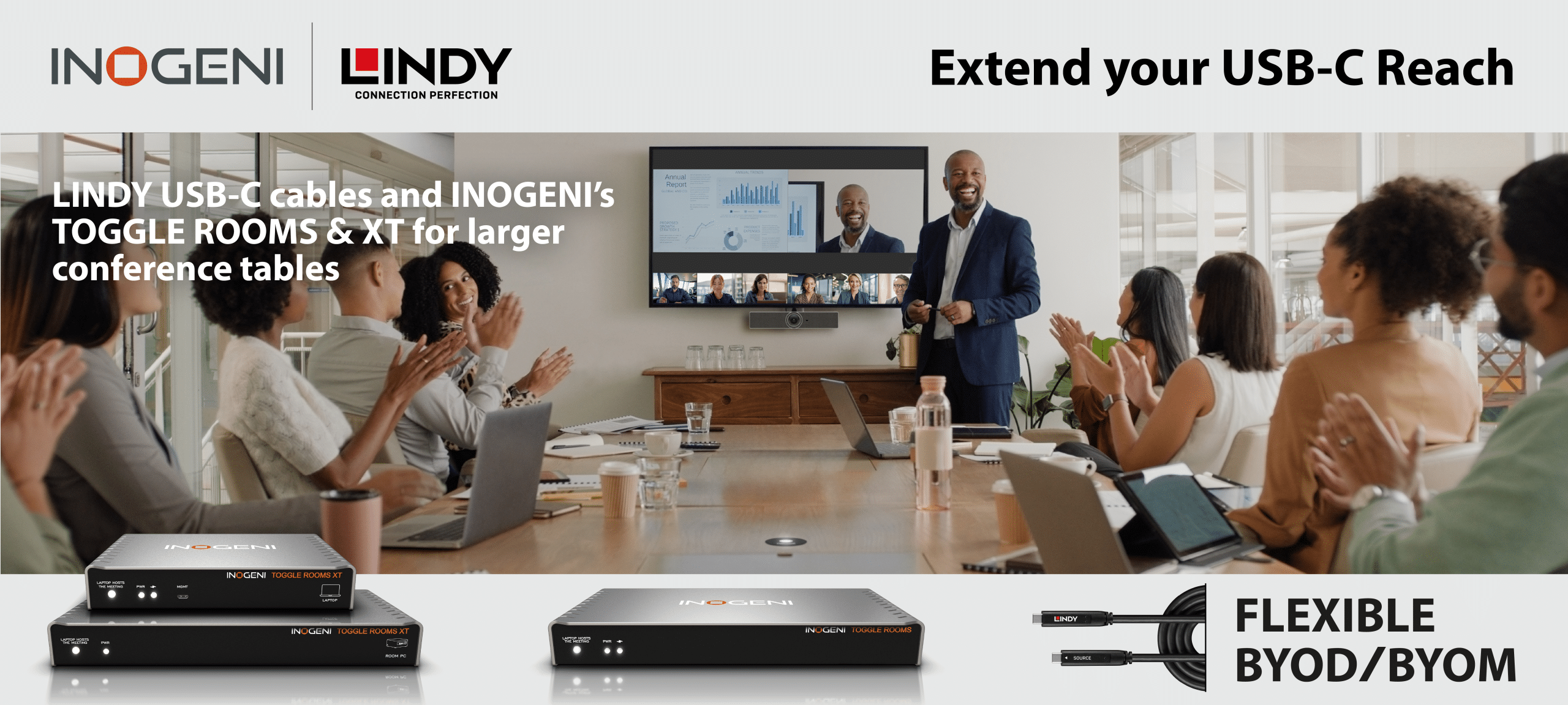 Flexibility and performance are key when it comes to designing the ultimate meeting room or large-scale AV setup. With the LINDY USB-C Hybrid Cable (available in 10 and 15 meters) and INOGENI’s TOGGLE ROOMS/TOGGLE ROOMS XT, you now have the perfect pairing to ensure seamless connectivity and superior functionality, even in the most demanding environments.