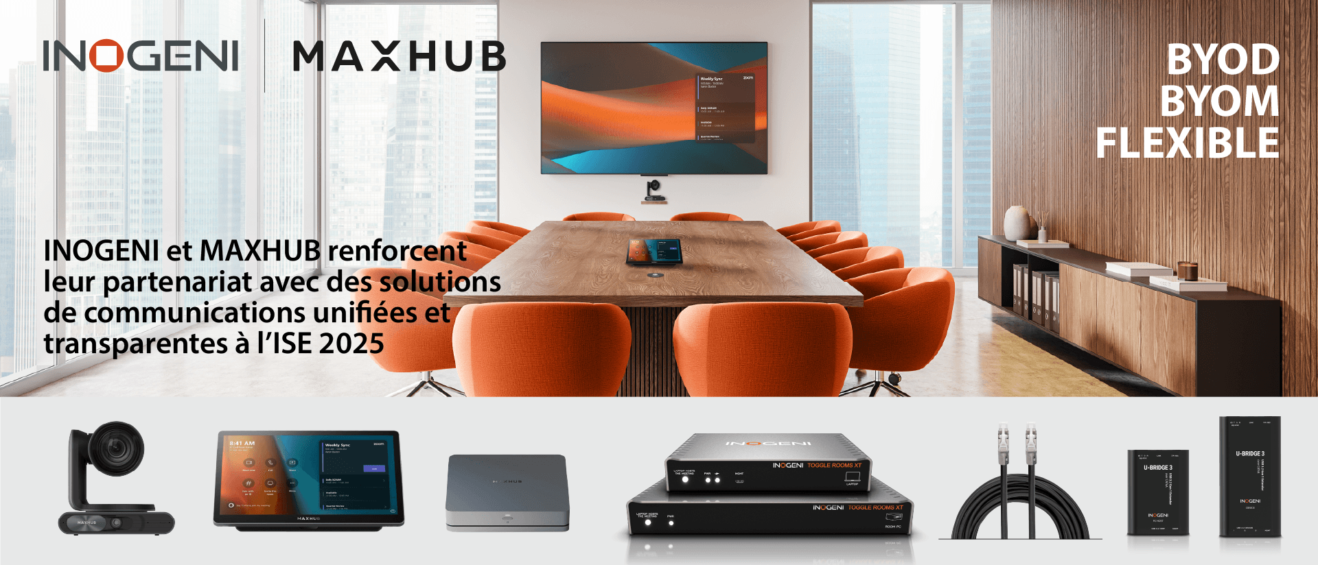 Depuis le début de leur partenariat en 2024, INOGENI et MAXHUB ont développé des solutions pro-AV flexibles et performantes pour les espaces de réunion modernes. La collaboration a débuté avec TOGGLE, un commutateur USB 3.0 intelligent pour deux hôtes, qui permet aux utilisateurs de basculer facilement entre les systèmes de conférence USB dans les salles et leurs propres ordinateurs portables pour les configurations BYOD/BYOM (Bring Your Own Device/Meeting).