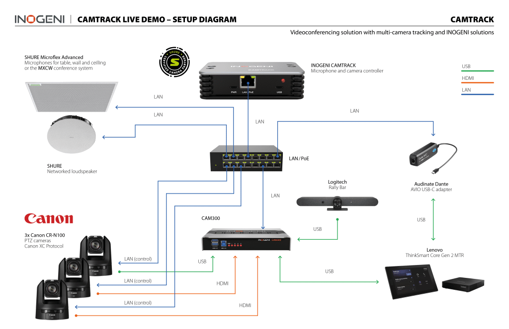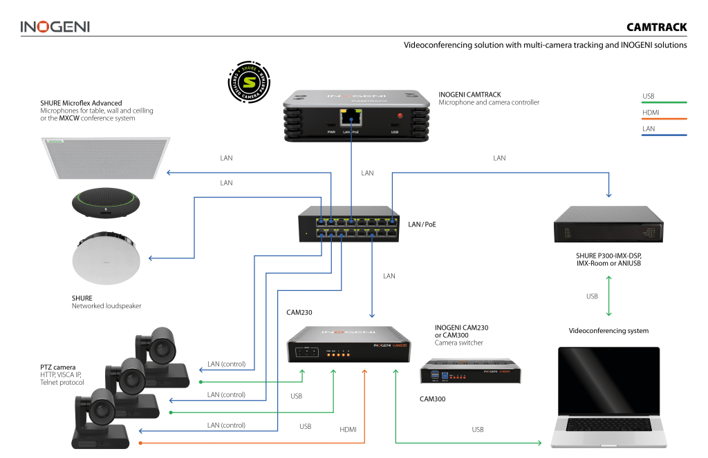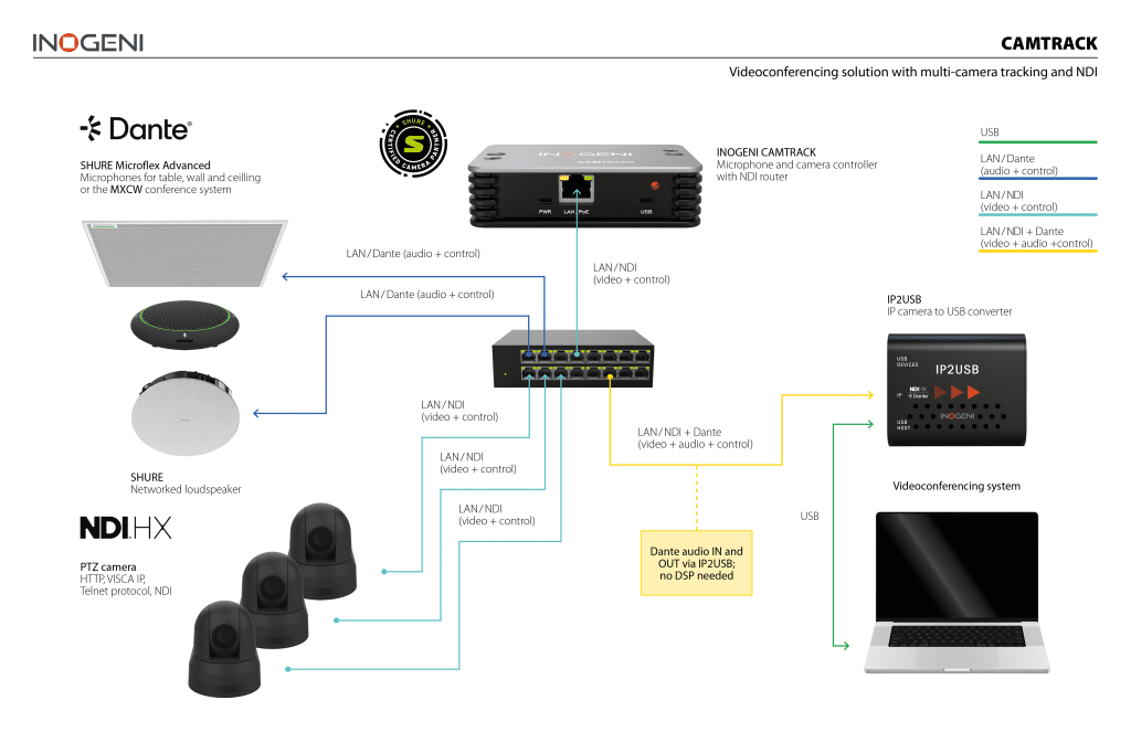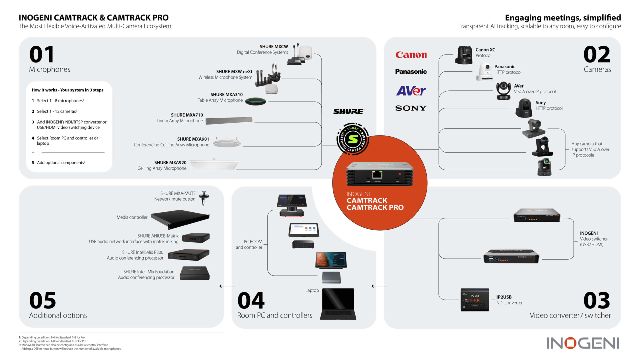 INOGENI CAMTRACK offre une production vidéo entièrement automatisée de qualité professionnelle qui garantit des expériences visuelles dynamiques et captivantes, sans nécessiter d’opérateur. Les appareils INOGENI tels que le CAM300 (2 caméras USB + 2 caméras HDMI), le CAM230 (2 caméras USB + 1 caméra HDMI) et l’IP2USB (plusieurs caméras NDI/RTSP) s’adaptent parfaitement à toutes les tailles et configurations de salles.