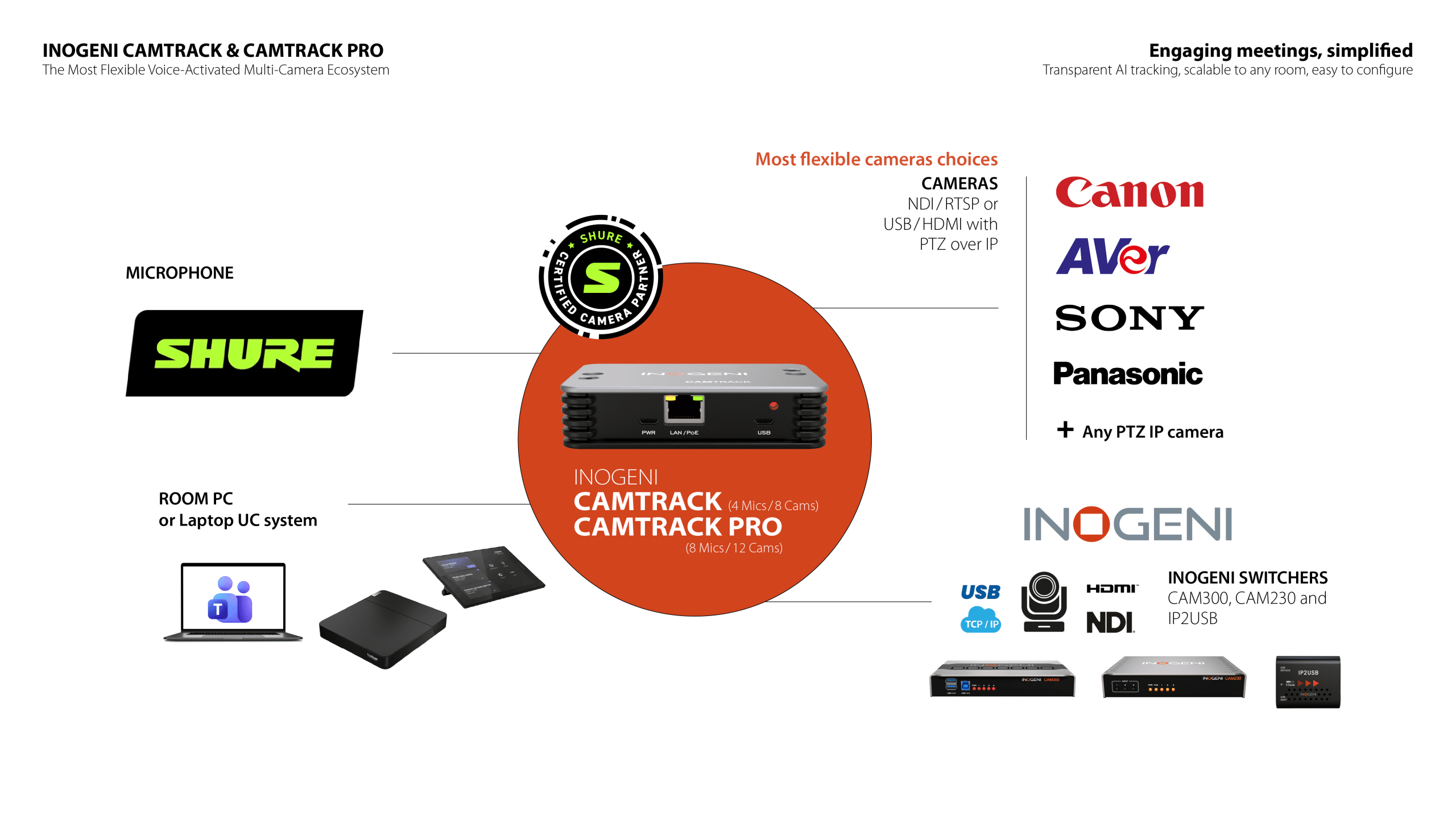 L’écosystème CAMTRACK réunit l’audio et la vidéo dans un flux de travail fluide et unifié, permettant ainsi des vidéoconférences dynamiques et de qualité professionnelle. En utilisant des microphones SHURE pour détecter les intervenants actifs, CAMTRACK gère intelligemment les caméras PTZ sur le réseau IP et fonctionne avec les commutateurs INOGENI ou le convertisseur IP2USB pour garantir que la bonne vue de la caméra est transmise aux PC ou ordinateurs portables de la salle équipés de logiciels CODEC, rendant ainsi chaque réunion fluide et sans effort.