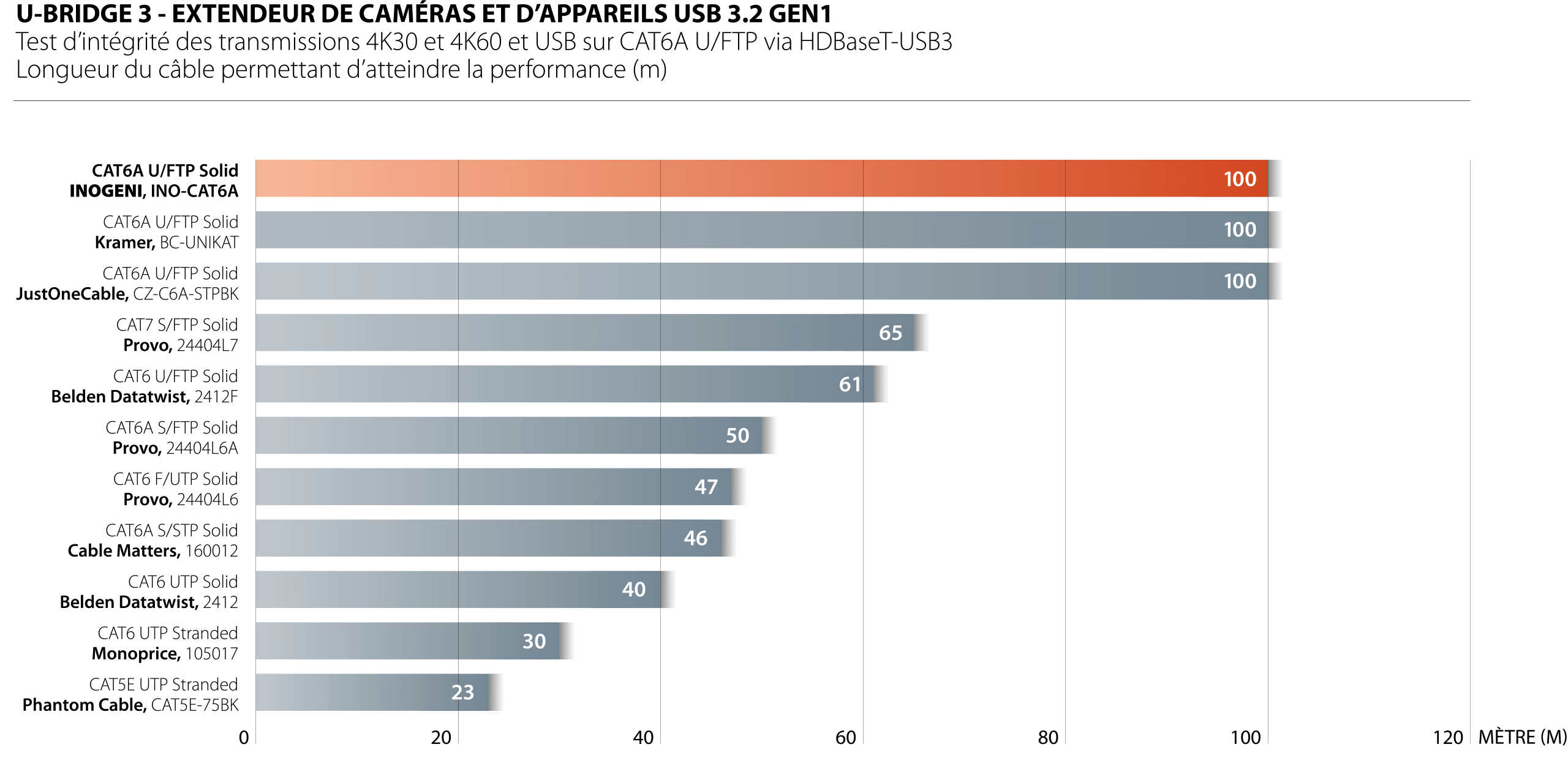 - INOGENI recommande l’utilisation du câble INO-CAT6A pour garantir une transmission optimale des signaux et une fiabilité maximale. Alors que d’autres fabricants de câbles peuvent fournir des niveaux de performance variables, le laboratoire d’INOGENI a effectué des tests approfondis pour vous donner la flexibilité de choisir votre marque de câble préférée.