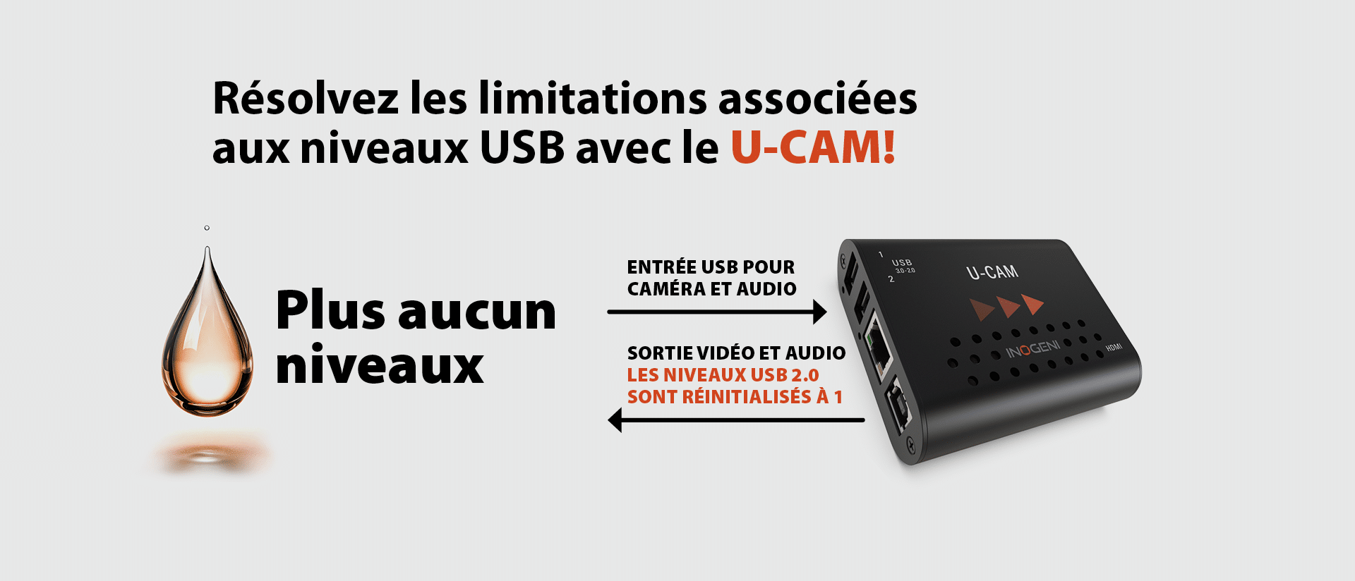 Le U-CAM optimise les flux vidéo et audio de l’USB 2.0 en réinitialisant efficacement les niveaux des hubs USB derrière son unité de traitement. Plutôt que de placer en cascade plusieurs hubs et extendeurs USB, le U-CAM réencode la vidéo et l’audio dans un nouveau périphérique composite USB, ce qui améliore considérablement la connectivité et la stabilité. Cela garantit une connexion stable et transparente à votre ordinateur portable sans surcharger la structure USB.
