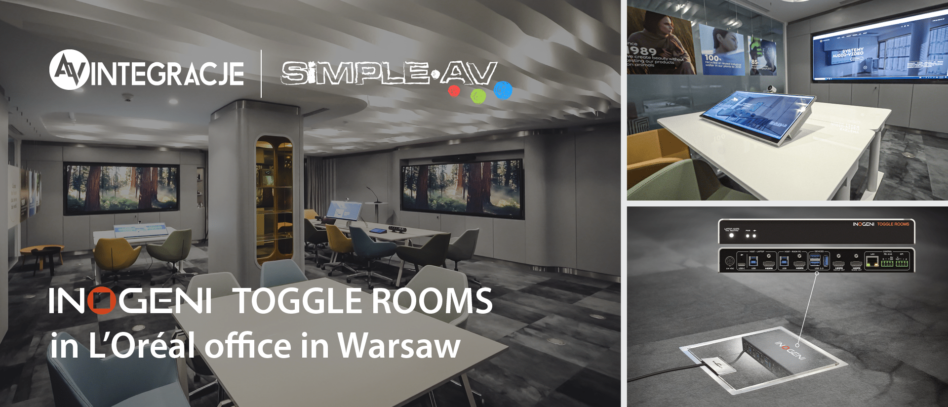 INOGENI TOGGLE ROOMS switches play a crucial role in ensuring the correct display of panoramic images in the Innovative Creative Workspace at L’Oréal Polska. To display signals from HDMI ports in a 21:9 format, it was necessary to use INOGENI TOGGLE ROOMS switches, which play a crucial role in ensuring the correct display of panoramic images in the Innovative Creative Workspace at L’Oréal Polska. These switches automate the entire signal-switching process, showing on the main monitors the source that was last connected, regardless of whether it is in USB-C or HDMI format.