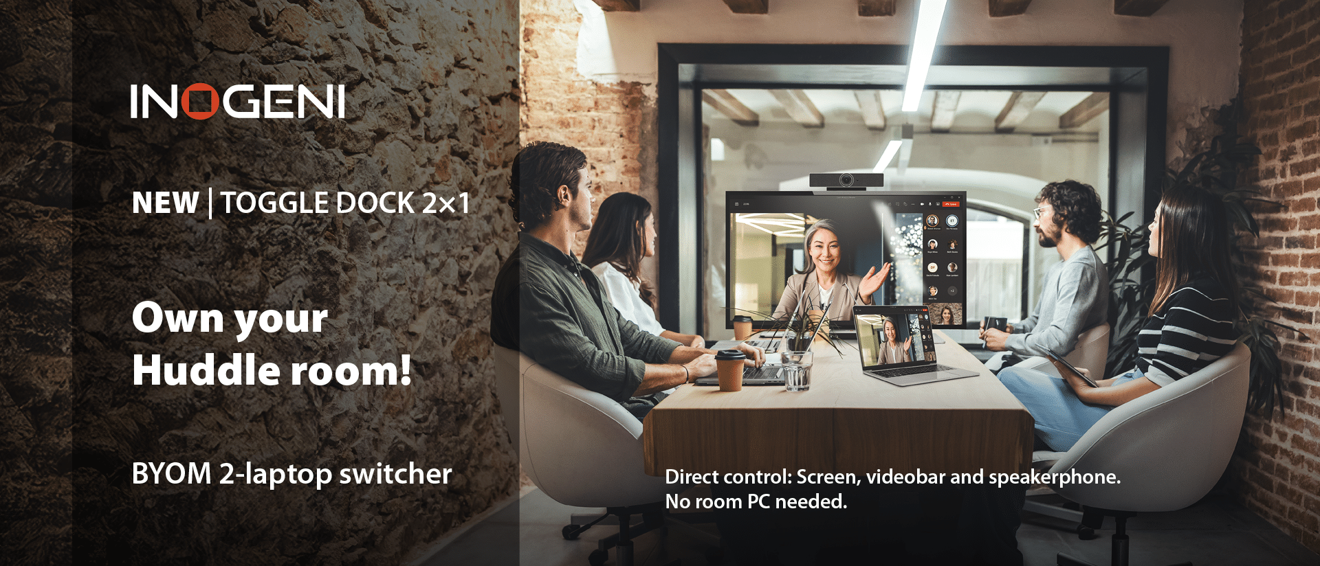 The TOGGLE DOCK 2×1 is part of INOGENI’s multi-award-winning TOGGLE Series (AV Awards 2021 & 2024), designed for professional BYOM video conferencing. All TOGGLE products enable seamless switching between two or more hosts for USB 3.0 peripherals. The TOGGLE ROOMS adds HDMI display switching and supports three hosts—including a Room PC or CODEC—for advanced content sharing, powered via a single USB-C 100W connection. The TOGGLE ROOMS XT offers the same features as the TOGGLE ROOMS but includes long-distance extension to the laptop, up to 70 meters (230 feet), making it ideal for larger meeting spaces.