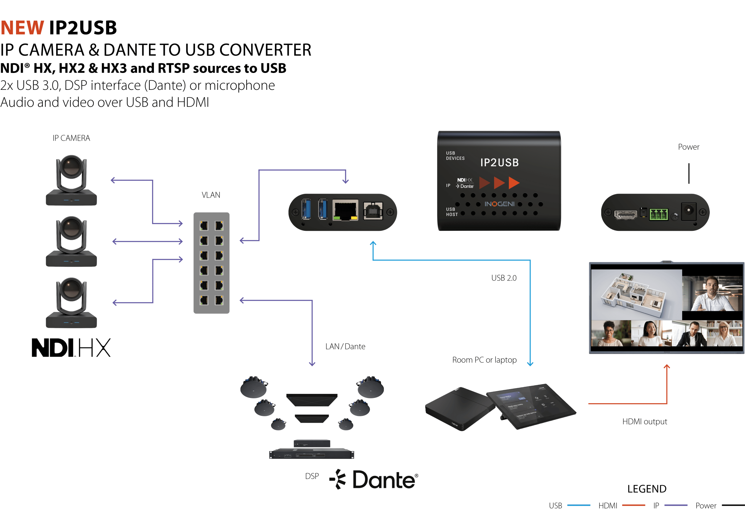The INOGENI IP2USB enables you to easily connect IP-based cameras to a laptop or UC system via USB, eliminating the need for costly USB extenders. The device converts AVoIP signals, such as NDI, NDI HX, and RTSP, into USB and HDMI outputs, simplifying integration with USB peripherals and video conferencing equipment. By leveraging IP-based communication, the IP2USB provides high-quality, low-latency video and audio streaming to laptops or CODEC systems, ensuring seamless connectivity in professional AV environments.