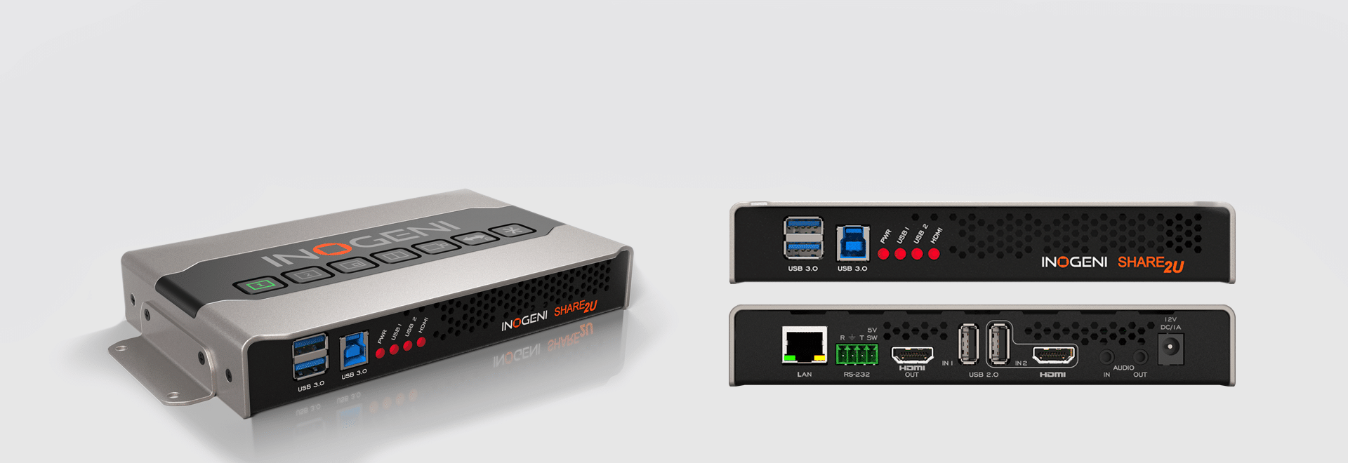 The SHARE2U Dual USB Camera to USB 3.0 Pro AV camera mixer can be controlled by an application on the host side using our USB HID, RS-232 or LAN interfaces. You can also use the keypad on the top of the device to control it manually.